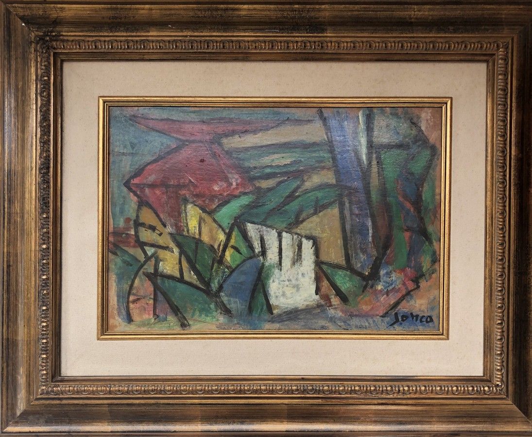 Marcel Janco, painter, born 1895, Bucharest, Romania. Immigrated 1941. 1915 Went to Switzerland and joined Hugo Bell, Jean Arp. 1916 -19 An originator of the Dada movement and participated in all its activities. Painted the famous masks in the style of African masks which were exhibited in "Cabaret Voltair". Painted abstract reliefs, combining expressionism and cubism. 1921 After a short time in Paris, returned to Bucharest, worked in architecture and was active in artists groups. 1948 A founder of New Horizons Group. 1953 A founder of the artists villege Ein Hod. Died 1984. .