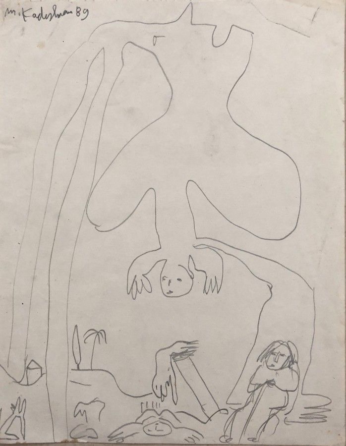 In 1988 Kadishman began a new series: Birth, with a silhouette of a mother giving birth, and created hundreds of variations of the theme. He linked the birth with the sacrifice. In the Sacrifice of Isaac Sarah becomes an active partner, as she symbolizes the mothers of the fallen soldiers.