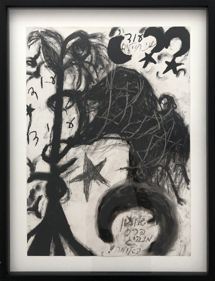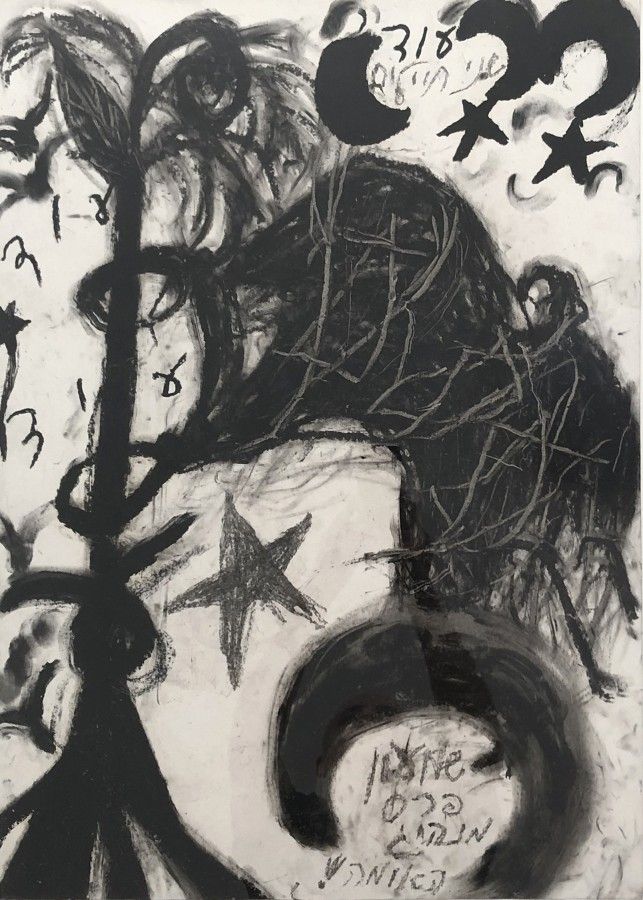 painter, born 1936, Tel Aviv. Lives in Tel Aviv. Moshe Gershuni was one of the first artists in Israel to explore highly modernistic , iconoclastic possibilities, at the end of the 1960s, creating works which were paradigms of Conceptual art, and in the 1970s extending his art to public performance. As a stimulating teacher in Bezalel, he fueled the imagination of many young artists, especially towards political involvement. At the Venice Biennale in 1980, Gershuni showed paintings on paper in red lacquer, amidst canals of blood, creating an atmosphere of Holocaust. Immediately afterwards he began a period of painting which stands out as a milestone in Israeli art. Using free scrawl, drip, finger paint, and calligraphy, he suggests personal, Zionist, Moslem and Christian symbols. These works seem to have been created in a trance. His recent silk screens ("Kaddish") are among the finest produced in the country in recent years.